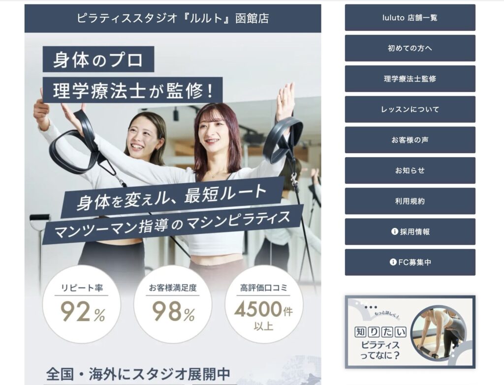 ルルト 函館店は、全国で90店舗以上展開している国内最大級のマンツーマン専用スタジオです。